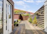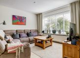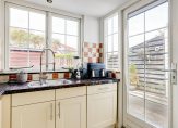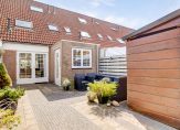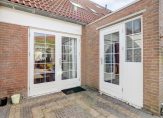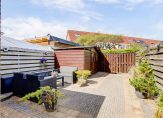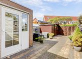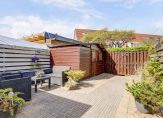 Toen je naar de voordeur liep, heb je de mooi aangelegde voortuin op het zuidoosten al gezien. Dit is een fijne plek om buiten te zitten, want de zon schijnt hier volop. Dit geldt ook voor de diepe achtertuin, op het noordwesten. Op de foto’s, gemaakt in april, kun je zien dat ook hier veel zon is. In de houten berging kunnen de fietsen staan en er is een poort naar de steeg.