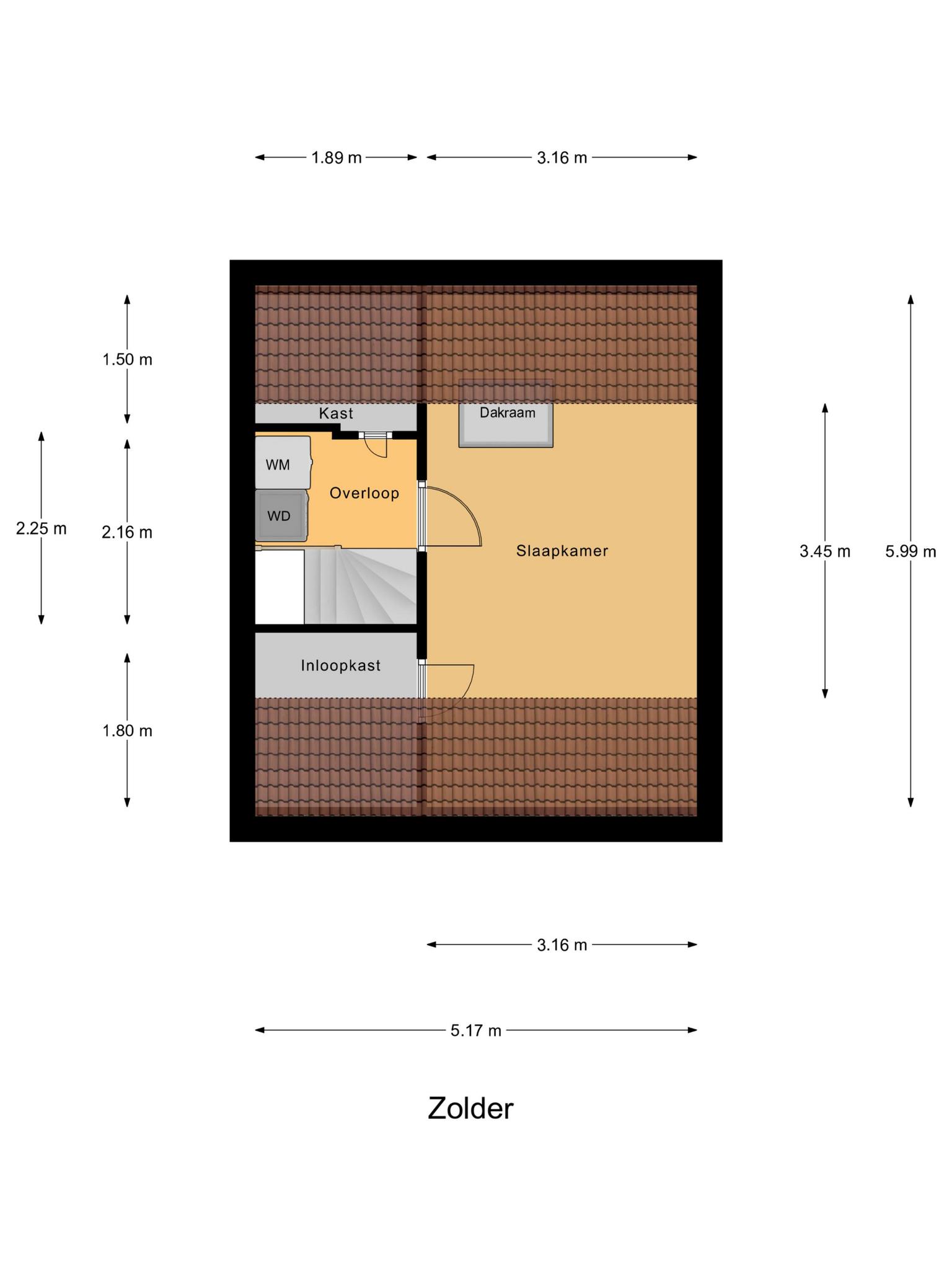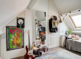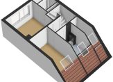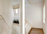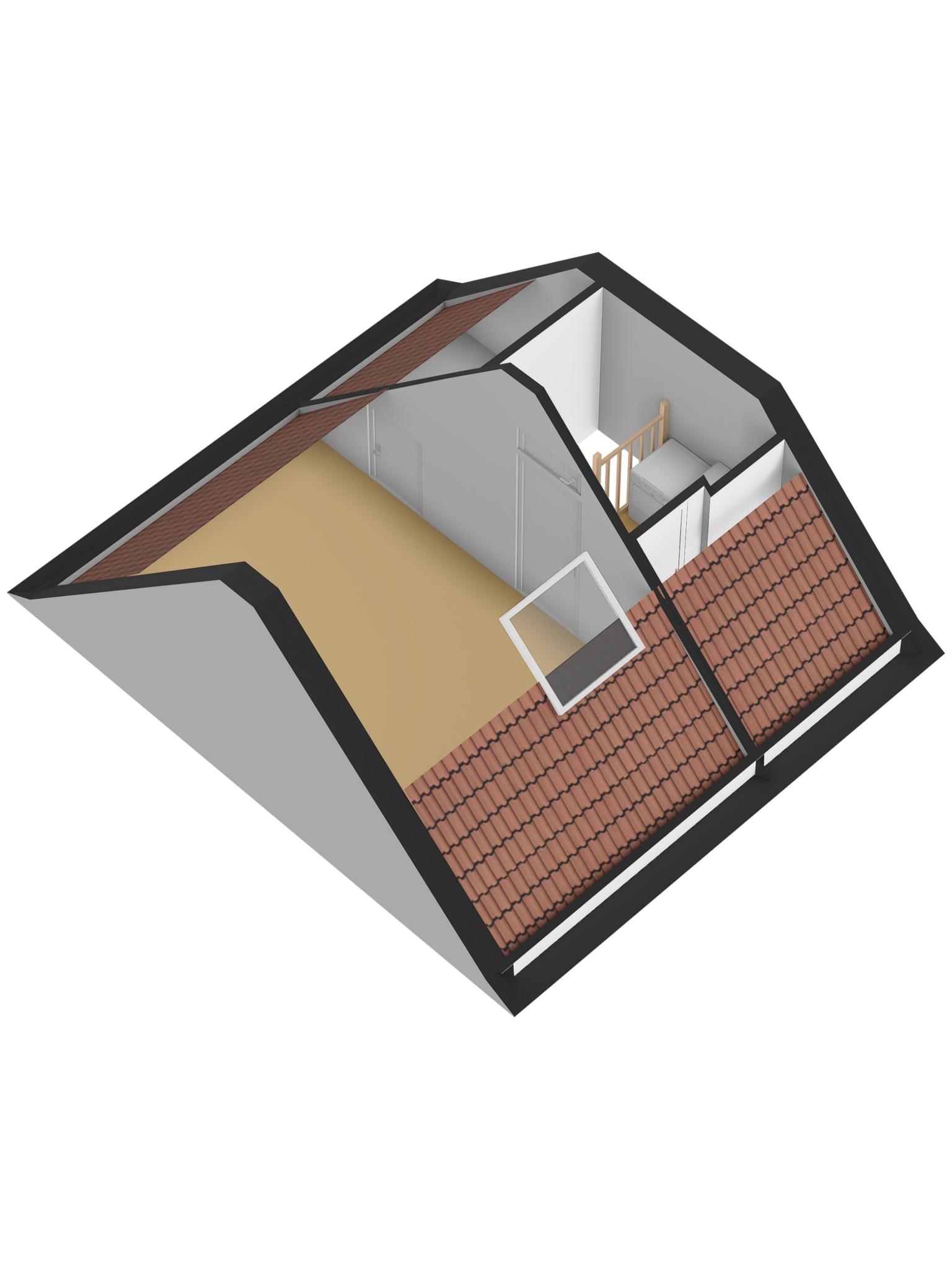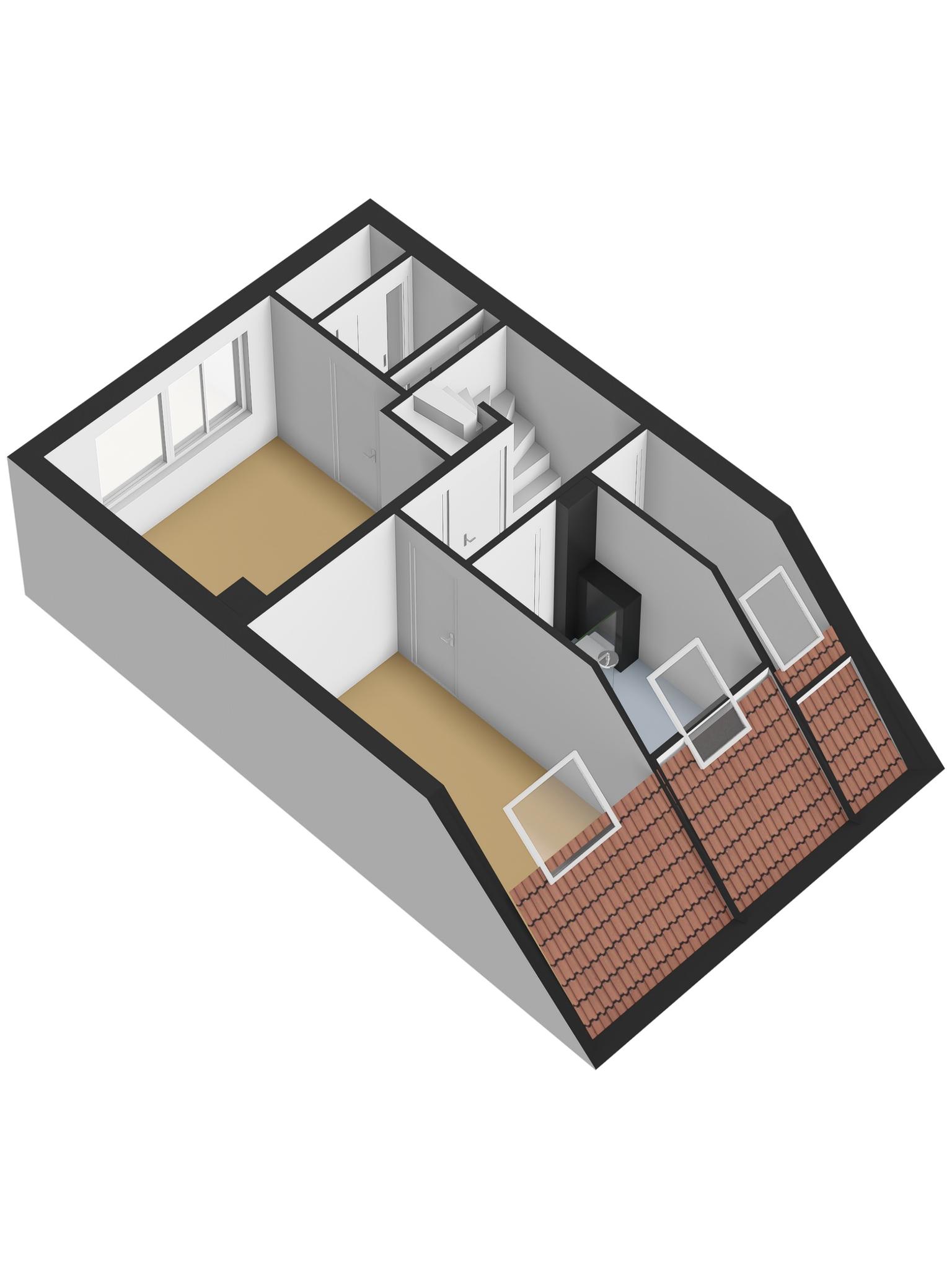 Een vaste trap geeft toegang tot de tweede verdieping. Als eerste is er een overloop, met een berging in de schuinte van het dak en de aansluitingen voor de wasapparatuur. Aansluitend is de derde slaapkamer, met een groot dakraam en een hoge nok. Achter de deur, waar nu een poster van Pink Flloyd hangt, is een berging die als kleedruimte wordt gebruikt.