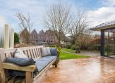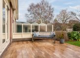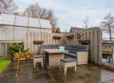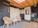 Direct naast het terras staat een fraaie tuinkamer van 12 m² met aan twee zijden glazen vouwwanden. Deze kunnen volledig open, waardoor een heerlijk overdekt buitenterras ontstaat dat naadloos aansluit op het onderheide terras (24 m²). De tuinkamer beschikt over een grote schuifkast en een aparte bergkast.