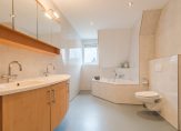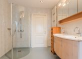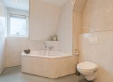 De volledig betegelde badkamer is voorzien van een inloopdouche met glazen wand, een hoekbad, dubbele wastafel, toilet, designradiator en vloerverwarming.