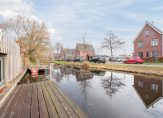 De woning is bereikbaar via een brug over het water. Aan de voorzijde ligt een royale voortuin met parkeergelegenheid voor twee auto’s op eigen terrein en een zonnig terras.