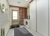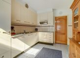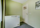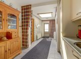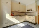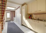 De ruime, gesloten keuken is praktisch ingedeeld en beschikt over een combimagnetron, inductiekookplaat, afzuigkap en een koelkast. Aan de keuken grenst de bijkeuken, voorzien van een handige kastenwand, lichtkoepel en de aansluitingen voor de wasapparatuur. Vanuit hier krijgt u toegang tot de ruime achtertuin.