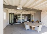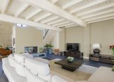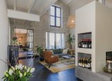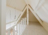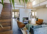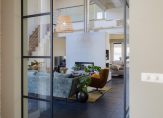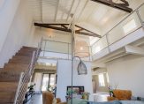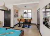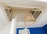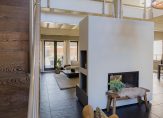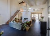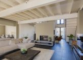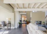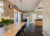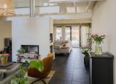 De oude bollenschuur is rondom geïsoleerd en verbouwd tot living. De riante woonkamer met vide en open haard is aan de ene zijde met een hoge stalen deur afgesloten van de keuken en aan de andere zijden geven openslaande deuren toegang tot de veranda en de zonnige tuin. Een roomdevider deelt de grote ruimte in 2 gezellige zitgedeeltes. Genoeg ruimte voor het hele gezin.