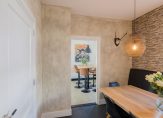 Aan twee zijden van de woning bevindt zich een entree; één aan de voorzijde en één aan de zijkant van de woning. De kamer aan de voorzijde is in gebruik als chill-kamer. De voormalige achterkamer is verbouwd tot een grote moderne woonkeuken die van alle gemakken is voorzien en toegang heeft tot de ruime bijkeuken.
