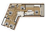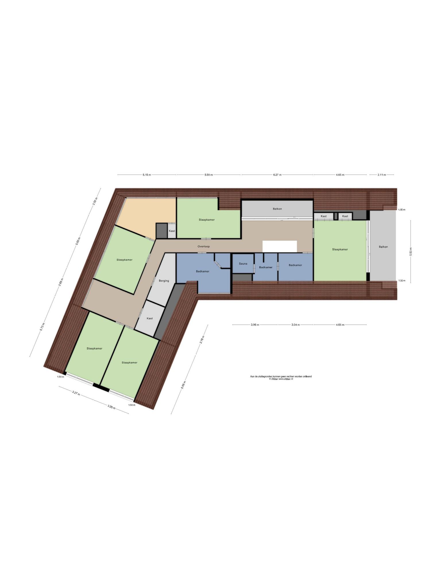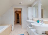Ruime en lichte overloop en gang met vaste kasten en schuifdeur naar het balkon. Op de verdieping zijn 5 slaapkamers van ca. 25, 20, 19, 19 en 18 m², waarvan 2 zijn voorzien van inloopkasten en de grootste is voorzien van kastenwand en toegang tot het balkon. 1 Slaapkamer is opgedeeld in een slaap- en werkkamer; de mogelijkheid bestaat om hier eventueel een 6e slaapkamer van de te maken. Op de verdieping zijn 2 badkamers van 17 en 15 m². De grootste badkamer is voorzien van sauna, jacuzzi, douchecabine en dubbele wastafel. De 2e badkamer moet opnieuw opgebouwd worden.