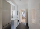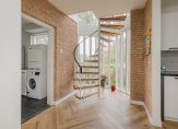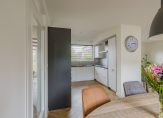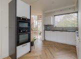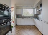De luxe keuken in L-opstelling is voorzien van alle inbouwapparatuur en heeft lichte fronten die zorgen voor een frisse uitstraling. Vanuit de keuken heb je toegang tot de hal én de praktische bijkeuken met ruimte voor wasmachine en droger. De bijkeuken biedt doorgang naar de verwarmde garage met wateraansluiting — ideaal voor de auto of als extra berging.