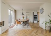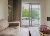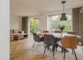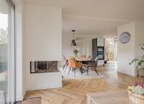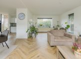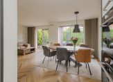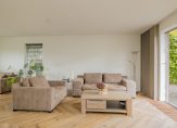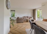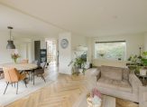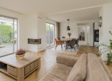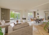 Je komt binnen in een ruime hal met een modern toilet en fonteintje. Vanuit hier stap je de royale woonkamer in met eethoek, halfopen keuken en een sfeervolle vloer. De strakke open haard is prachtig verwerkt in de schouw en vormt een echte eyecatcher. De wanden zijn licht gestuukt en via twee schuifpuien loop je zo de tuin in.