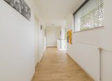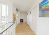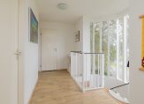 Via een bijzonder vormgegeven trap met veel glas bereik je de eerste etage. De royale overloop geeft toegang tot vier slaapkamers en twee badkamers.