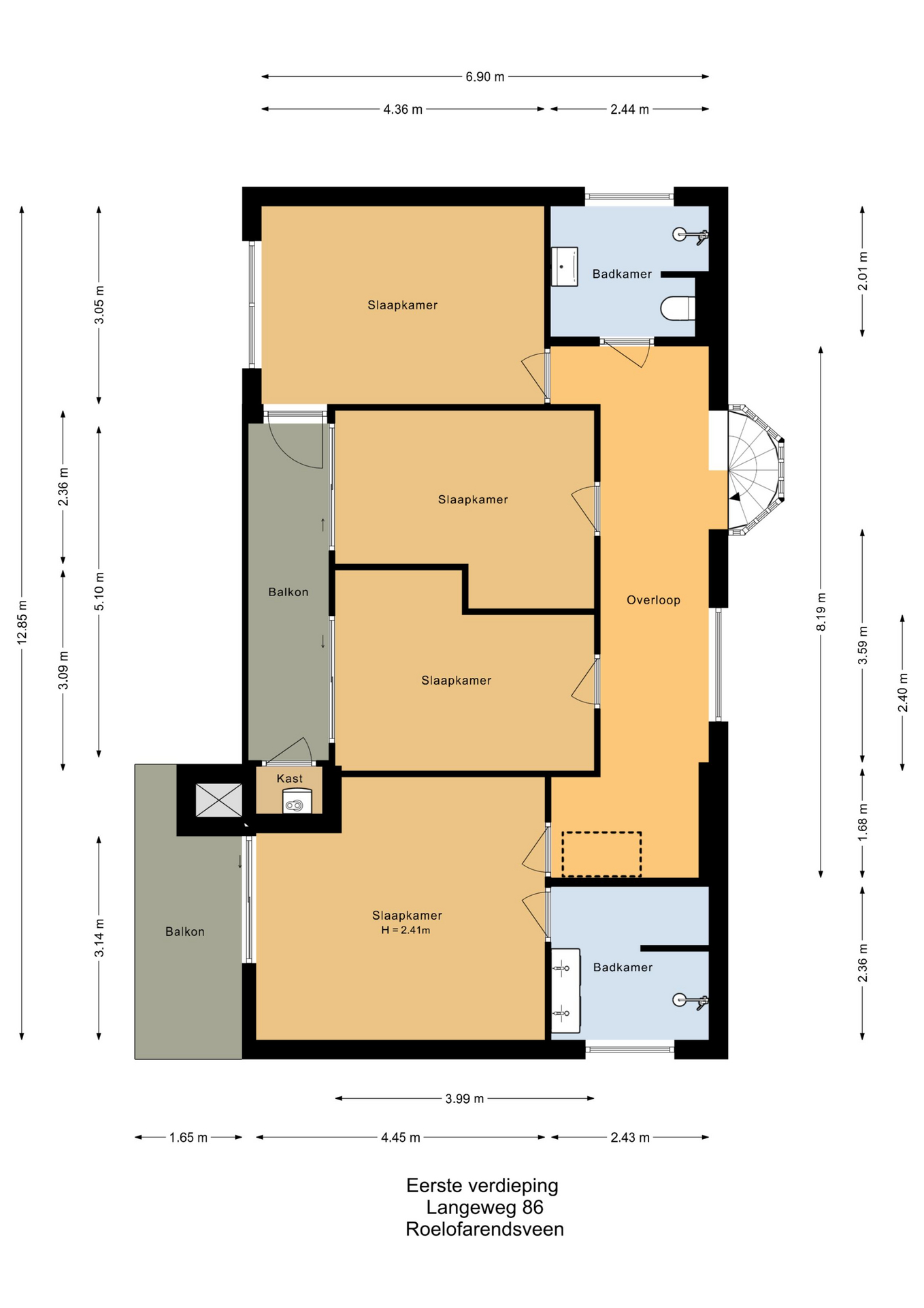 De ouderslaapkamer heeft een vaste kastenwand en directe toegang tot de eerste badkamer met dubbele wastafel en douche. De tweede badkamer is uitgerust met een douche, toilet en wastafel. Alle slaapkamers hebben toegang tot één van de twee balkons.