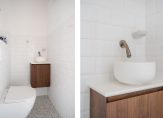 Off the hallway is a modern guest WC with timeless tiling, a walnut vanity unit with washbasin, and a cupboard housing the central heating system (Intergas, 2004) and additional storage space.