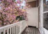 A wide, light-filled entrance gives access to a spacious hallway with a recessed cloak area. The floor throughout this level is a beautifully maintained oak. The generous en suite living and dining room features fitted cabinets, a display cupboard, an elegant fireplace, and large windows allowing for exceptional natural light. French doors open onto a sizeable balcony, catching the morning sun and offering a peaceful view over the private garden below. A practical built-in balcony cupboard offers extra storage.
