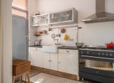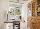 A separate hallway cupboard houses the washing machine and dryer, with additional storage available in another fixed cupboard. The third bedroom or home office features a striking beamed ceiling, new sisal carpet, HR++ glazing, wooden frames, and a garden door providing direct access to the outdoors.