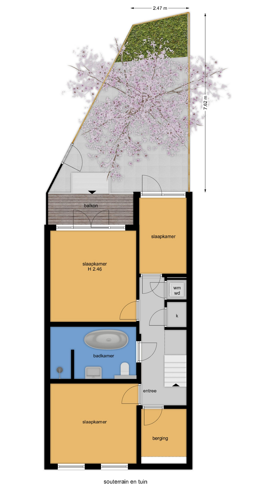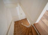 Originele trap naar het souterrain met de 1e zeer lichte ruime slaapkamer aan de voorzijde met speelse massief houten vloer. Ruime inpandige berging (ca. 4 m2) met de moderne groepenkast en waterontharder.