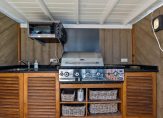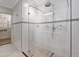 De luxe badkamer is gesitueerd tussen de slaapvertrekken in en is vanuit de gang bereikbaar. Deze badkamer is uitgerust met een grote inloopdouche die vanuit 2 zijden bereikbaar is. Het fraaie wit-hooglans badmeubel met dubbele wastafels en spiegelmasten maakt het geheel af. Het 2e toilet is separaat en tevens vanuit de gang bereikbaar. Daarnaast is er een grote bergkast aanwezig voor het opruimen van o.a. de buitenkussens.