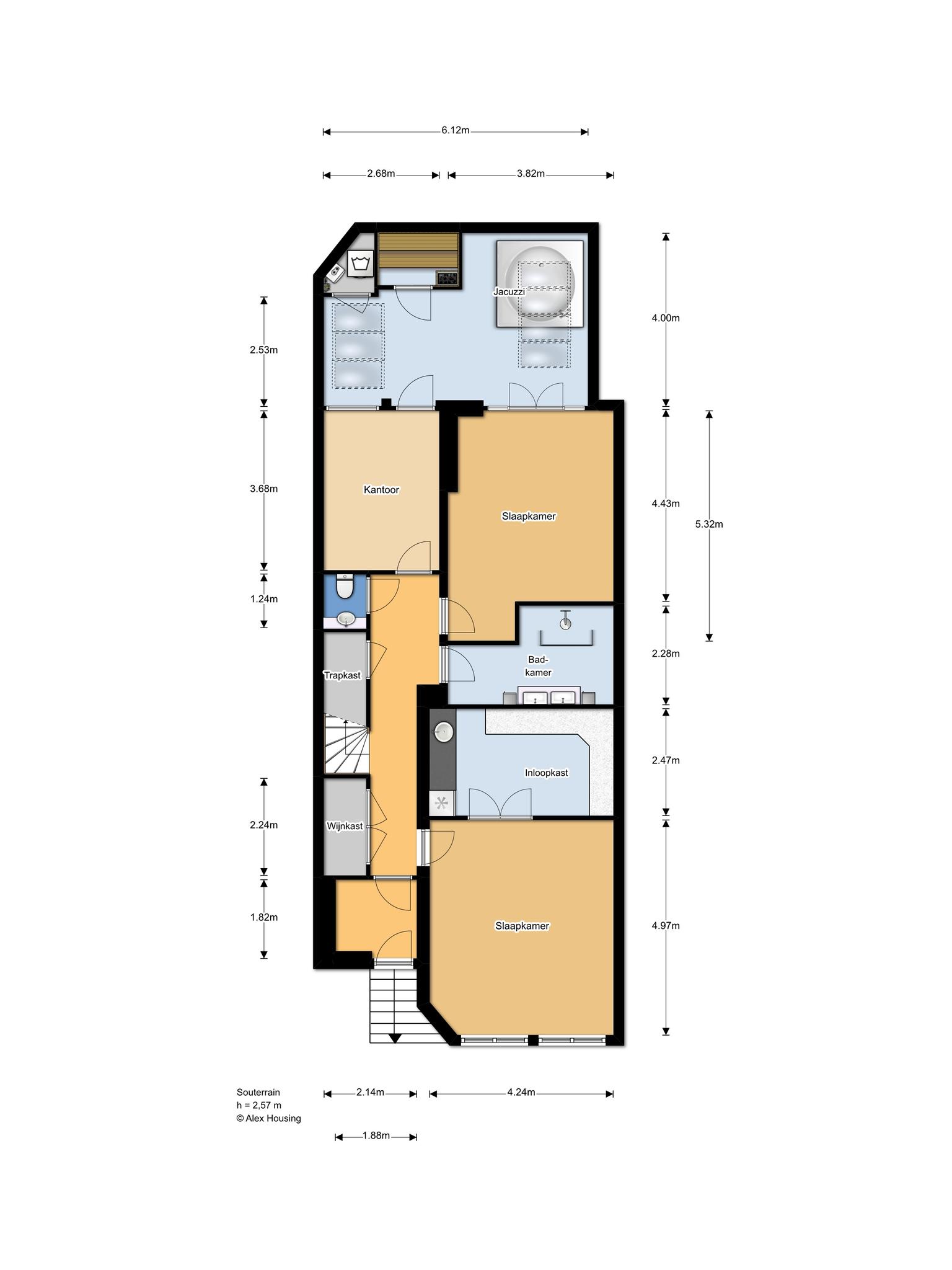 Via de gang en de binnentrap bereikt u het souterrain. Daarnaast is het souterrain ook buitenom bereikbaar via de voortuin, hal en gang. In het souterrain bevinden zich de slaapvertrekken en de wellness alsmede de 2e keuken, badkamer, separaat toilet , bergkast en een enorme wijnkast met klimaatkast voor de fijnproevers. Aan de voorzijde van het appartement is de royale masterbedroom gelegen. Deze zeer ruime slaapkamer is uitgerust met een grote inloop-garderobe en een eigen keuken. Ook deze keuken is van alle gemakken voorzien van o.a. een koelkast, combi-oven, inbouw gaskookplaat, afzuigkap enz. ideaal voor een inwonend kind, een au-pair of voor een vroeg kopje koffie/ ontbijtje op bed.