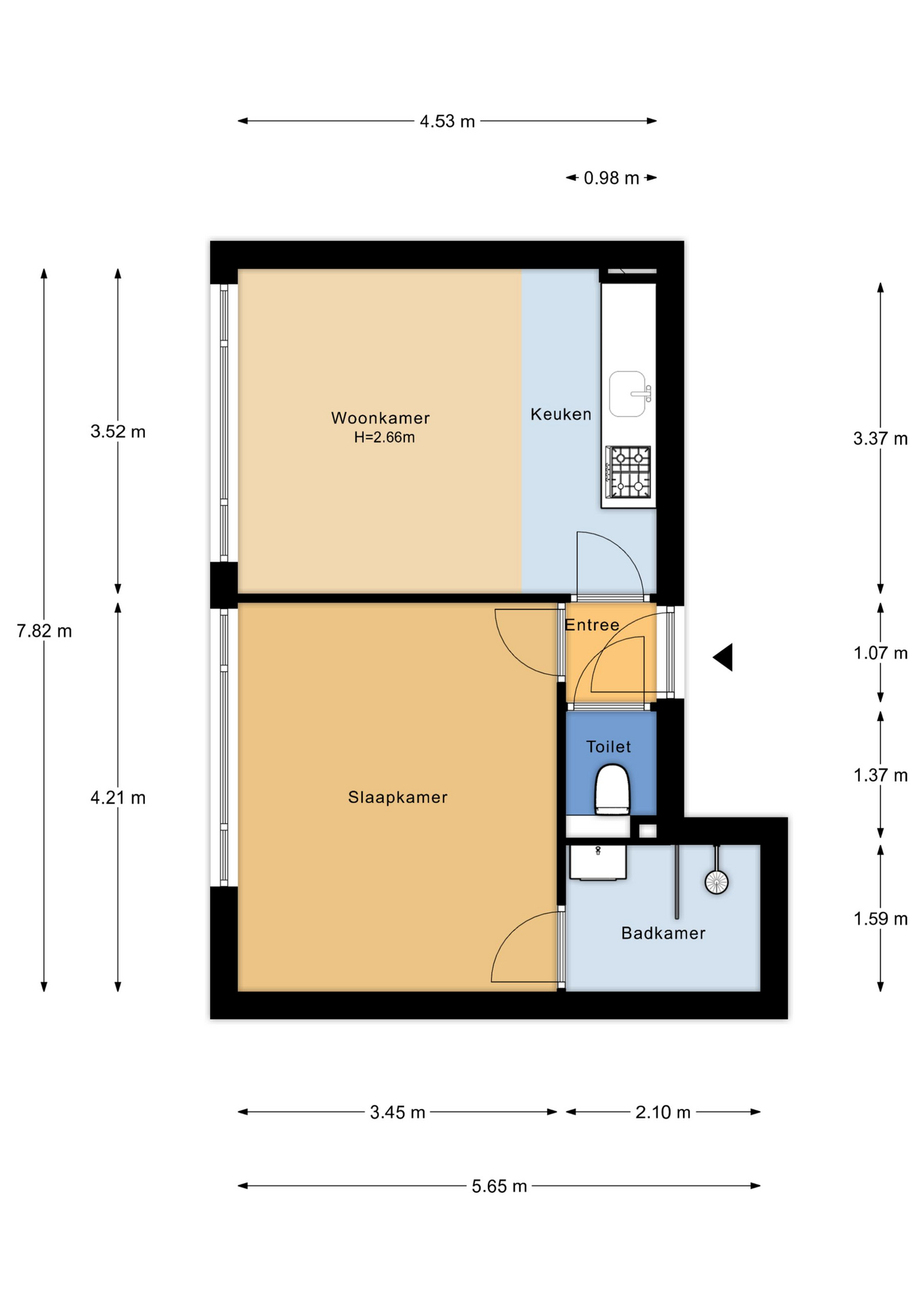 Gezamenlijke entree, trap naar de tweede etage, entree appartement, hal met apart toilet, woonkamer met grote raampartijen met dubbel glas aan de voorzijde, open keuken voorzien van gaskookplaat, wasemkap, gootsteen en koel-/vriescombinatie. Vanuit de woonkamer de riante slaapkamer met fraai betegelde badkamer voorzien van badkamermeubel met wastafel en inloopdouche met glazen wand.