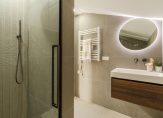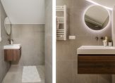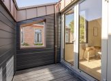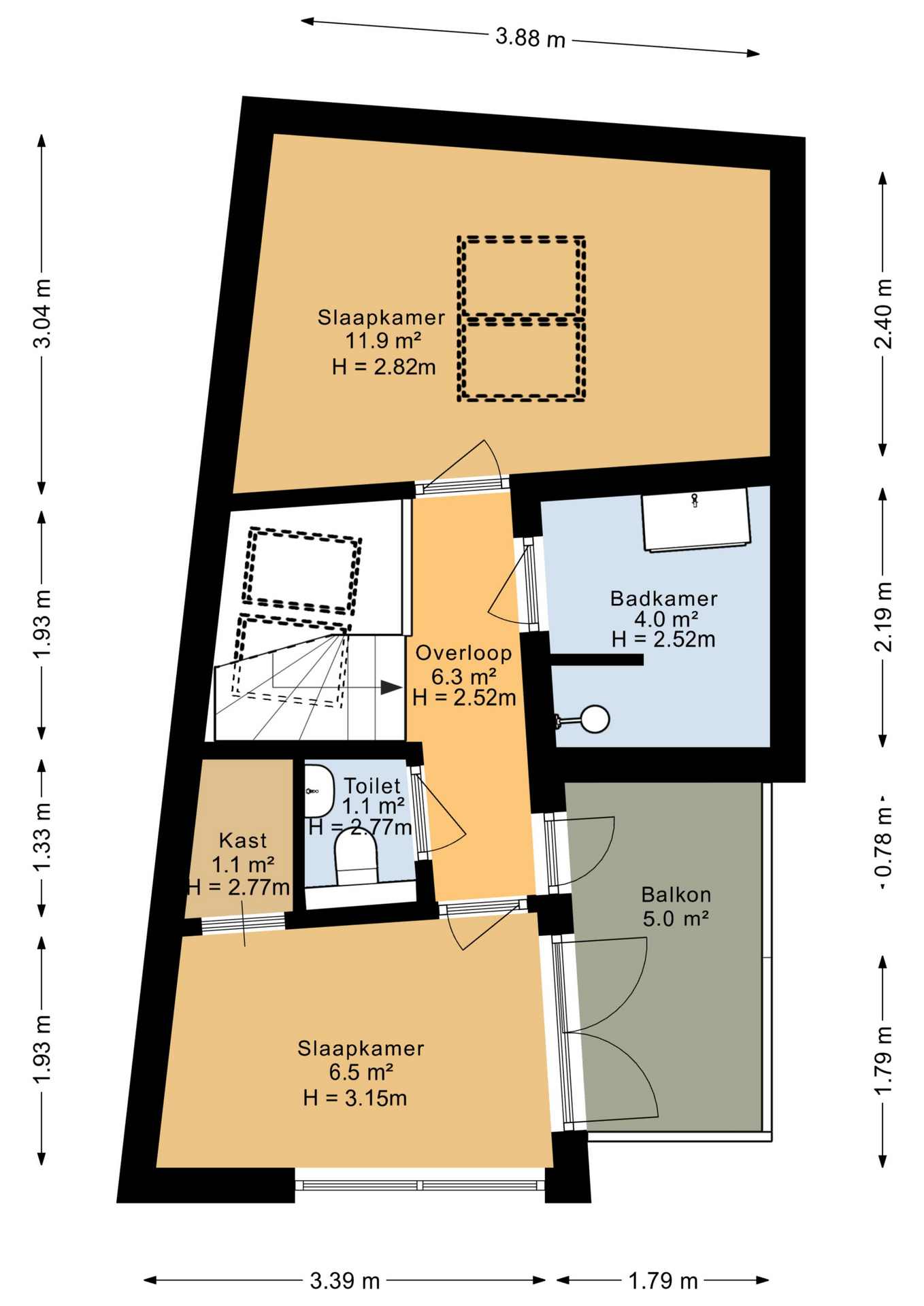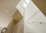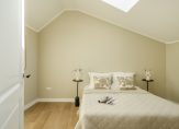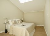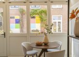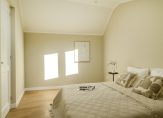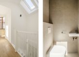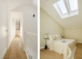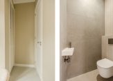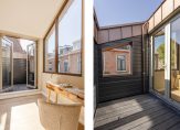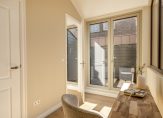 Vanuit de woonkamer de trap naar de eerste etage, overloop met schitterende lichtinval dankzij groot daklicht, apart toilet en toegang tot leuk terras pal zuidwest dat hoogwaardig is afgewerkt. Aan de achterzijde de hoofdslaapkamer over de volle breedte van de woning met goede nokhoogte en twee grote daklichten. Aan de voorzijde nog een goed formaat slaapkamer voorzien van vaste kast en openslaande deuren naar terras. De tussengelegen badkamer beschikt over fraai lichtgrijs tegelwerk, ingebouwd leidingwerk, handdoekradiator, inloopdouche met glazen deur, spiegel met verlichting en walnootlook badkamermeubel.