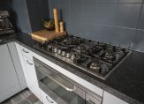 The open kitchen is arranged in a practical U-shape, providing ample counter space. It is fully equipped with a Boretti gas cooker with oven, combi-oven, dishwasher, fridge-freezer, and extractor fan.