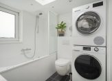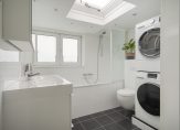 The bathroom is illuminated by a roof light and includes a bath with shower, washbasin with vanity unit, towel radiator, second WC, and space for a washing machine and dryer.