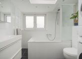 Verdieping: Via de trap bereik je de tweede etage. De overloop heeft een vaste kast met een Intergas CV-ketel uit 2018, bergruimte en een luik die toegang geeft tot een ruime vliering, perfect voor het opslaan van vakantiespullen. Aan de achterzijde bevindt zich de grote master bedroom met een schuifkastenwand over de gehele breedte, een dakkapel met kunststof kozijn en dubbel glas én uitzicht op de vuurtoren van Scheveningen. De badkamer is voorzien van een daklicht, bad met douche, wastafelmeubel, handdoekradiator, tweede toilet en ruimte voor wasmachine en droger. De tweede (met inbouwkast) en derde slaapkamer liggen aan de voorzijde en hebben beide een dakkapel en kunststof kozijnen met dubbel glas.