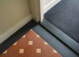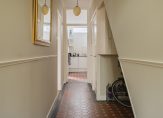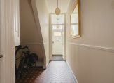 Entree, vestibule met tochtdeur naar de gang met fraaie plavuizen vloer, bergruimte onder de trap voor bijvoorbeeld fietsen, bergkast en een toilet.