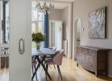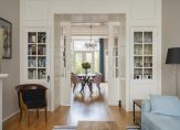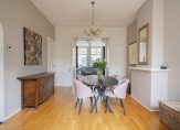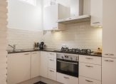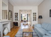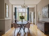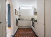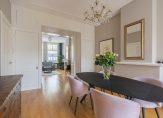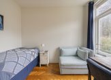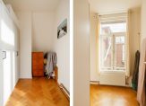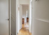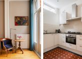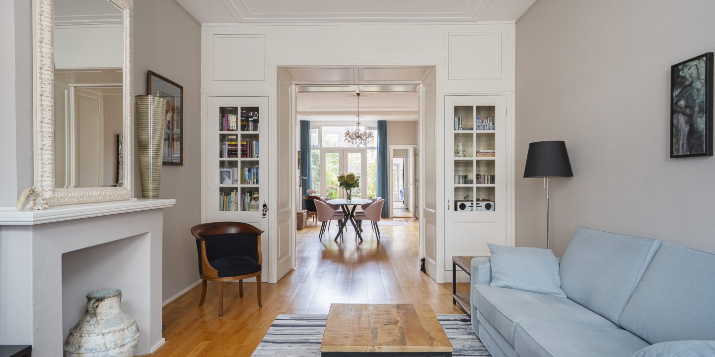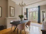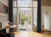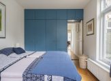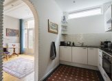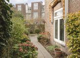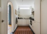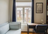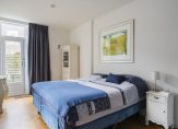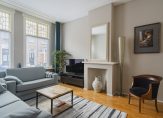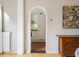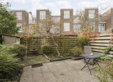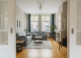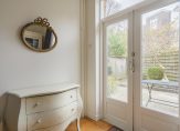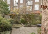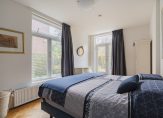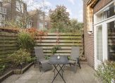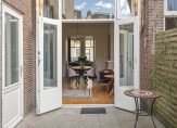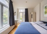 De ruime lichte kamer en suite is voorzien van een separatie met schuifdeuren en vaste kasten plafonds met lijstwerk, glas-in-lood bovenlichten, lamelparketvloer en openslaande deuren naar de heerlijk zonnige L-vormige tuin gelegen op ZW. De ruime moderne keuken met inbouwapparatuur is zowel bereikbaar vanuit de gang als vanuit de woonkamer.