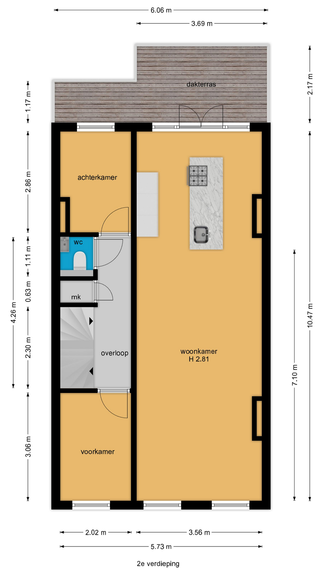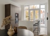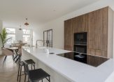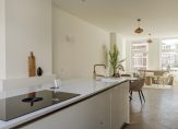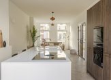 Gezamenlijke entree, trap naar de eerste etage, entree appartement, trap naar de tweede etage, hal met apart toilet voorzien van zijkamers aan beide zijden die als werkkamer of inloopkast gebruikt kunnen worden. Vanuit de hal fraaie deuren met glasroedeverdeling naar de woon-/eetkamer voorzien van visgraat pvc-vloer, achterterras over de volle breedte en schitterende open keuken voorzien van kookeiland met Bora inductiekookplaat, Quooker, composiet werkblad, vaatwasser en wandgedeelte met walnootlook kasten, Siemens bakoven, Siemens inbouwmagnetron en koel-/vriescombinatie.