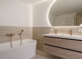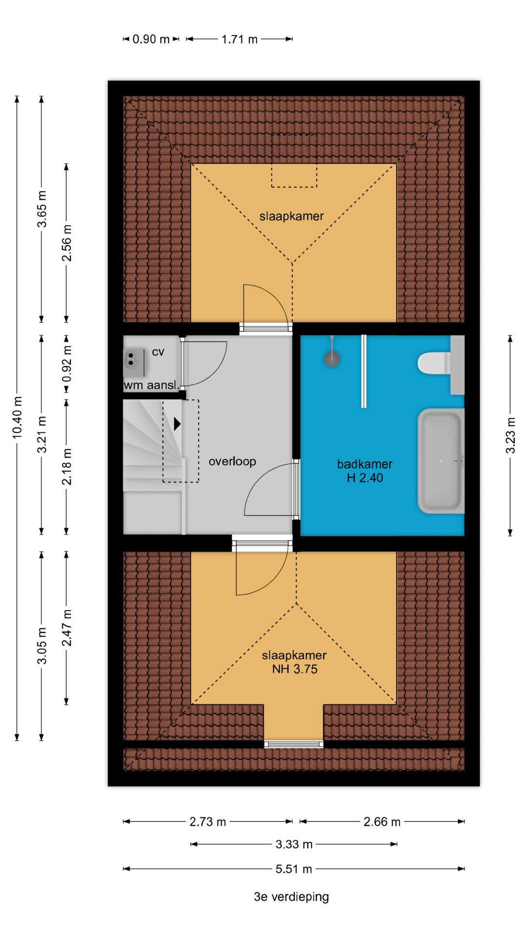 Vanuit de hal de trap naar de derde etage voorzien van riante slaapkamer met dakkapel aan de voorzijde, tweede goed formaat slaapkamer rustig gelegen aan de achterzijde en tussengelegen badkamer voorzien van hoogwaardig tegelwerk, badkamer meubel dubbele kranen, ronde spiegel met verlichting, inloopdouche met nis en glazen wand, handdoekradiator en wandcloset.