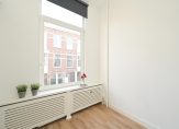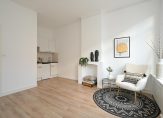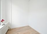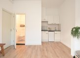 Entree van het gebouw, trap naar de eerste etage, entree appartement, woonkamer met keurige laminaatvloer en open keuken voorzien van eenvoudig keukenblok, gaskookplaat en losse koelkast. De lichtinval is uitstekend vanwege de grote raampartijen en plafondhoogte van meer de drie meter. De slaapkamer is eveneens aan de voorzijde gelegen en beschikt over een groot raam.
