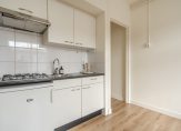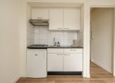 Entree van het gebouw, trap naar de tweede etage, entree appartement, woonkamer met keurige laminaatvloer en open keuken voorzien van eenvoudig keukenblok, gaskookplaat en losse koelkast. De lichtinval is uitstekend vanwege de grote raampartijen. De slaapkamer is aan de achterzijde gelegen en beschikt over grote pui met openslaande deur naar het achterbalkon van ca. 4m² . Tenslotte een moderne badruimte met douche, wastafel en toilet.