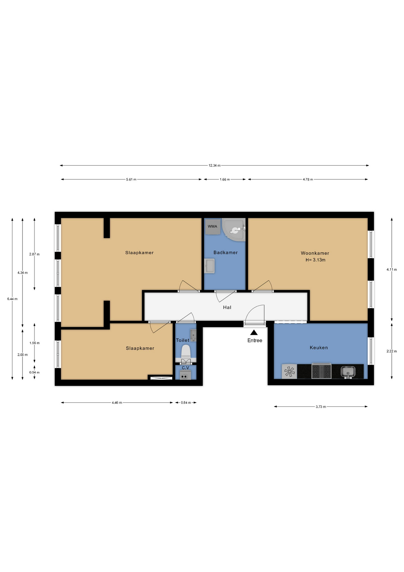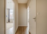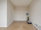 Gezamenlijk entree, meterkasten, trap naar de eerste etage, entree appartement, hal met apart toilet voorzien van fraai tegelwerk, vaste kast met cv-ketel, wandcloset en fonteintje. Aan de voorzijde is de woonkamer gelegen met hoog plafond, gestuukte wanden, laminaatvloer en gunstige lichtinval dankzij grote raampartijen. De moderne keuken is eveneens aan de voorzijde gelegen en beschikt over kunststof werkblad, koel-/vriescombinatie, combimagnetron en vaatwasser. De twee slaapkamers zijn uitzonderlijk ruim van formaat en rustig gelegen aan de achterzijde van het gebouw. De tussengelegen badkamer is voorzien van hoogwaardig tegelwerk, meubel met wastafel, handdoekradiator en keurige douchecabine.