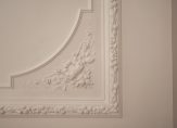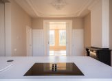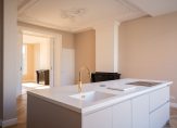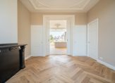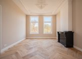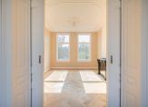 Eigen entree op de begane grond, trap naar de eerste etage, overloop voorzien van uitzonderlijk ruim toilet voorzien van fraai tegelwerk, meubel en wandcloset. Vanuit de hal de schitterende kamers en suite waar een unieke harmonie is ontstaan tussen modern wooncomfort en karakteristieke details Deze suites beschikken over gerestaureerde ornamenten plafonds, suiteseparatie met vaste kasten en visgraat parketvloer.