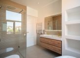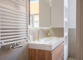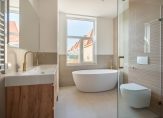 Vanuit de hal de trap naar de tweede etage, overloop voorzien van groot daklicht waardoor een zeer gunstige lichtinval is ontstaan. Aan de achterzijde de hoofdslaapkamer voorzien van openslaande deuren naar achterterras van ca. 13 m² over de volle breedte van de woning. Aan de voorzijde nog twee ruime slaapkamers waar in beide gemakkelijk een 2-persoons bed en kast geplaatst kan worden. De stijlvolle badkamer is aan de achterzijde gesitueerd en voorzien van fraai tegelwerk, meubel met wastafel, vrijstaand ligbad, inloopdouche met glazen wand, toilet en handdoekradiator. Tot slot op deze etage de technische ruimte met cv-ketel en opstelplaats voor wasmachine en droger.