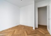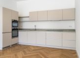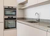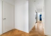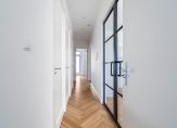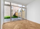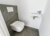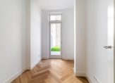 Entree van het gebouw, entree van de woning met hal voorzien van technische ruimte, trap naar de kelder en toilet voorzien van fraai tegelwerk, wandcloset en fonteintje. Vanuit de hal dubbele deuren met glasroedeverdeling naar ruime woonkamer met visgraat parketvloer en gunstige lichtinval dankzij grote raampartij aan de voorzijde. De nieuwe luxe keuken is voorzien van koel-/vriescombinatie, hoog model bakoven, combimagnetron, hardstenen werkblad en brede inductiekookplaat.