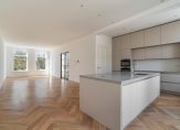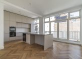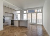 Entree van het gebouw, entree appartement met meterkast en trap naar de 1e etage, hal met zijkamer aan de voorzijde en apart toilet voorzien van fraai tegelwerk, wandcloset en fonteintje. Vanuit de hal dubbele deuren met glasroedeverdeling naar doorgebroken woon-/eetkamer met fantastisch vrij uitzicht over het karakteristieke Koningsplein. Aan de achterzijde de hoogwaardige open keuken voorzien van spoeleiland met hardstenen werkblad, wijnklimaatkast, kastruimte, vaatwasser en wandgedeelte voorzien van koel-/vriescombinatie, hoog model bakoven, combimagnetron, hardstenen werkblad, veel kastruimte brede inductiekookplaat. Aan de woonkamer grenst een fantastisch terras over de volle breedte dat gunstig is gelegen op het zuidoosten en over veel privacy beschikt. Er praktisch is de bijkeuken die grenst aan het wandgedeelte en gebruikt kan worden als inpandige berging. De lichtinval op deze etage is ronduit spectaculair te noemen dankzij de ca. 3 meter hoge plafonds en de grote raampartijen aan beide zijden.