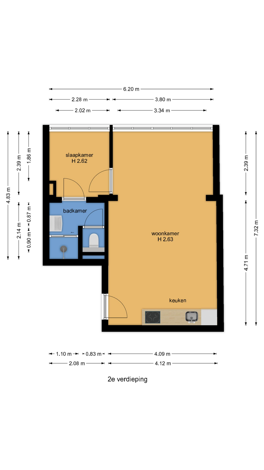 Gezamenlijke entree op straatniveau met een ruime hal voorzien van de meterkast, trap naar de tweede verdieping met entree naar het appartement, ruime woonkamer met grote raampartijen en open keuken voorzien van koelkast, aparte vriezer, oven, inductiekookplaat en afzuigkap. Vanuit de woonkamer toegang tot de rustig gelegen slaapkamer aan de achterzijde, met een heerlijk vrij uitzicht over de achtergelegen tuinen. Vanuit de slaapkamer is de moderne badkamer bereikbaar voorzien van fraai tegelwerk een ruime douche met glazen schuifdeur, regendouche, handdouche en badkamermeubel met wastafel. In de badkamer bevindt zich tevens het toilet, dat is afgescheiden met een aparte deur.
