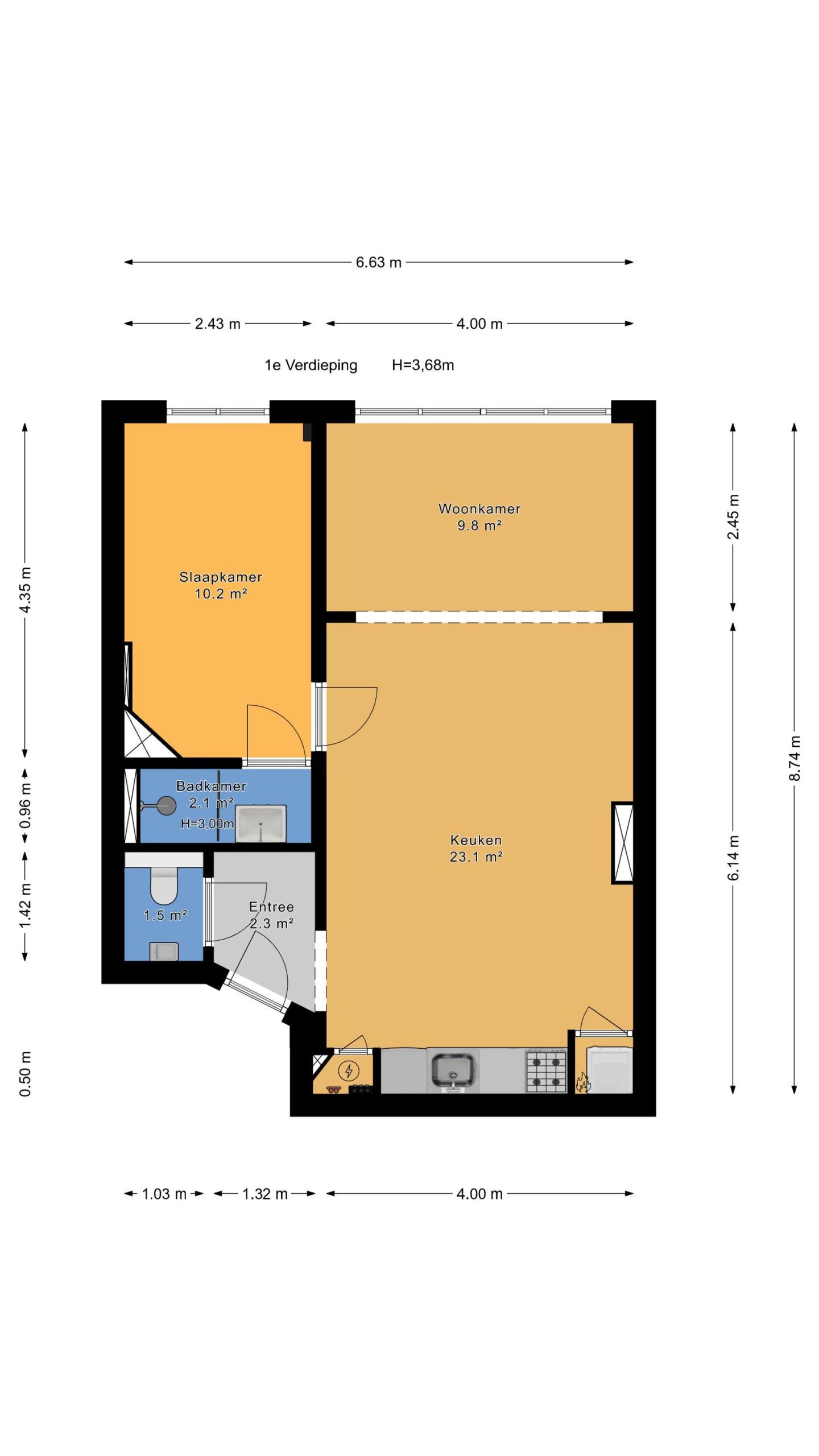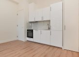 Gezamenlijk entree van het complex, trap naar de eerste etage, entree appartement, hal met apart toilet, woonkamer met hoog plafond, laminaatvloer en grote raampartijen. De nieuwe luxe open keuken is voorzien van inductiekookplaat, koel-/vriescombinatie, hoog model bakoven, afzuigkap en vaatwasser. De slaapkamer is ruim van formaat en rustig gelegen aan de achterzijde van het gebouw. De tussengelegen luxe badkamer is voorzien van fraai tegelwerk, inloopdouche met glazen deur en badkamermeubel met wastafel.