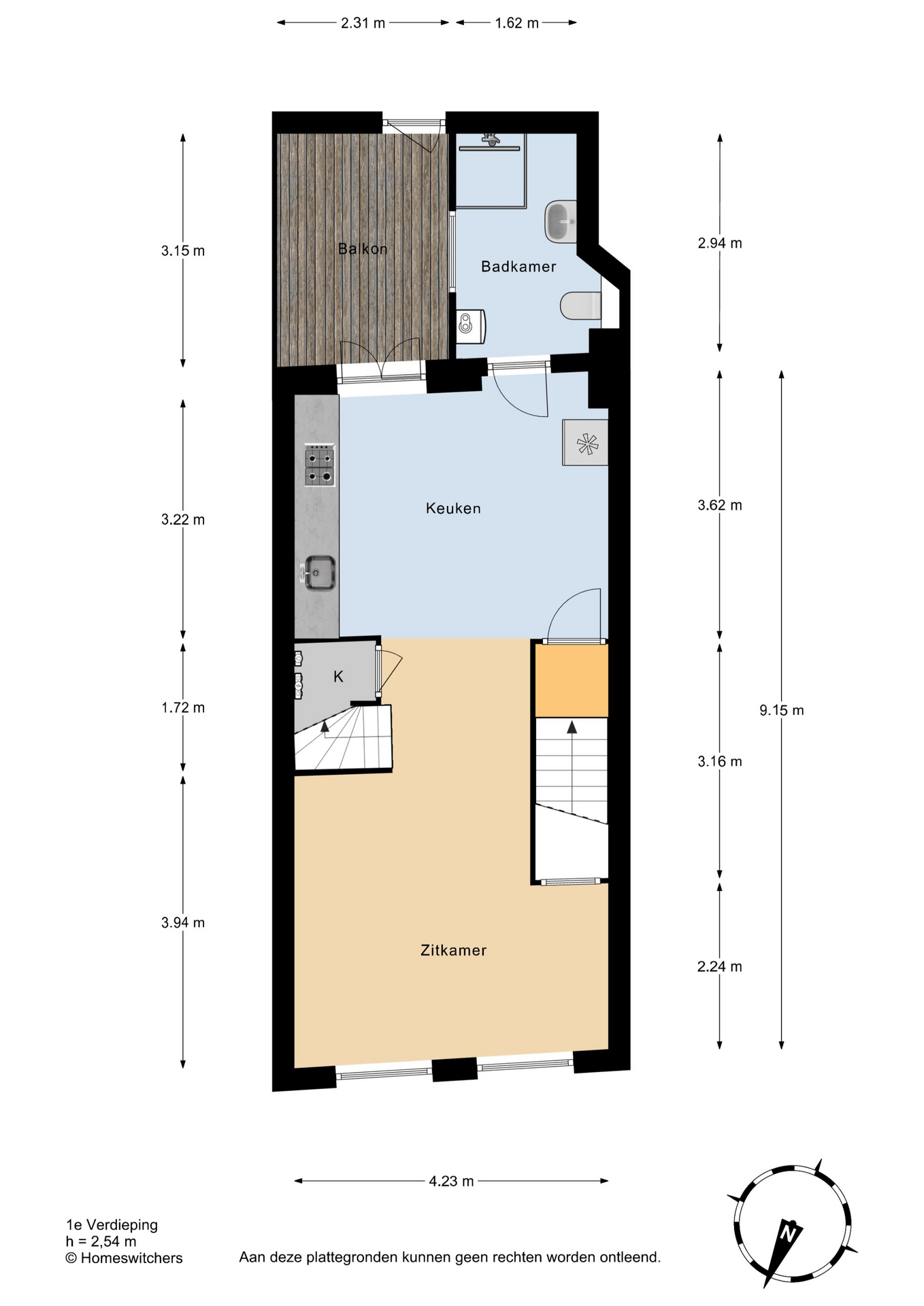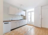 Gemeenschappelijke entree op straatniveau, entree van de woning en de trap naar de eerste etage. Hier bevindt zich de ruime, open woon-/eetkamer met een open keuken, uitgerust met een koelkast, wasbak, 4-pits gasfornuis en afzuigkap. Aan de achterzijde ligt een terras van ruim formaat gunstig gelegen op de ochtend- en middagzon. De badkamer is eveneens aan de achterzijde gelegen en voorzien van douche, wasbak, spiegelkast, toilet en aansluiting voor een wasmachine. Voorts trap naar de tweede etage, overloop met ruime opbergkast en toegang tot de slaapkamers aan zowel de voor- als achterzijde van de woning.