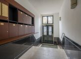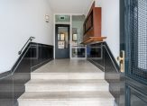 A stately entrance with an intercom panel leads via three steps to the raised ground floor, where the private entrance of the apartment is located.