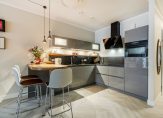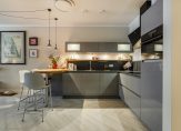 The luxurious open-plan kitchen is fully fitted with all modern built-in appliances, including a dishwasher, fridge/freezer, induction hob, extractor hood, combi oven and a convivial breakfast bar.