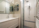 De en-suite badkamer heeft een regen- en handdouche, een handdoekradiator, zitje, breed badkamer meubel en een spiegel met verlichting.
