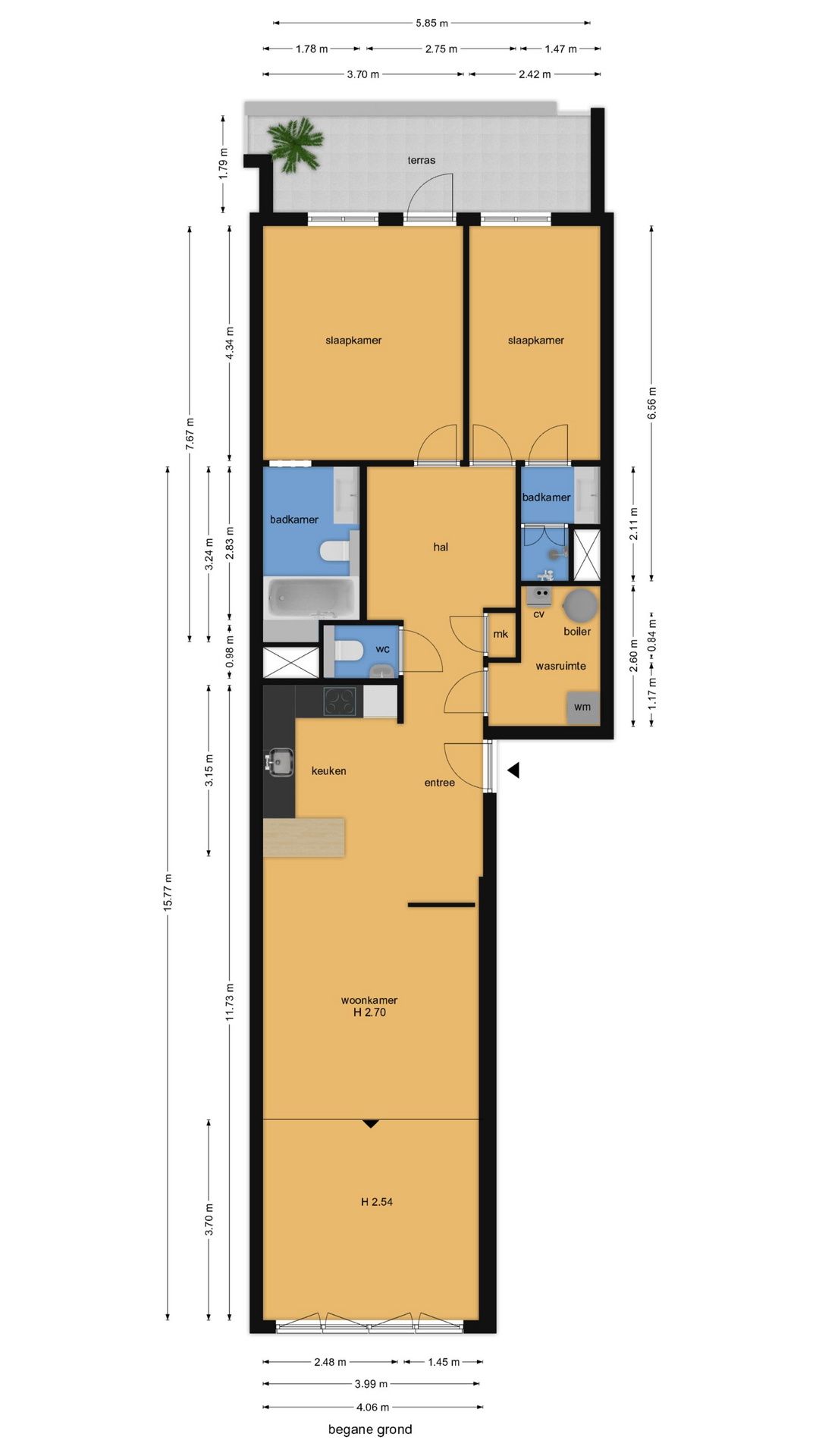 In de riante hal bevindt zich een diepe vaste kast met opstelplaats voor de cv ketel, de wasmachine, de boiler en ruim plaats voor een garderobe. Separaat modern toilet met fonteintje.