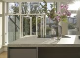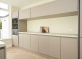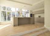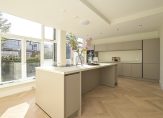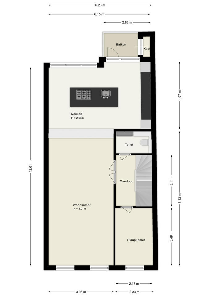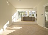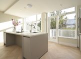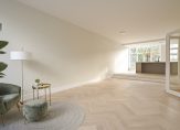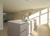 Eigen entree op de begane grond met uitzonderlijk ruime hal, meterkast met uitgebreide elektrische installatie, trap naar de eerste etage voorzien van overloop met ruim toilet voorzien van designfontein, wandcloset, nis met verlichting en fraai tegelwerk. Vanuit de woonkamer dubbele deuren met glas naar de riante woonkamer voorzien van visgraat lamelparketvloer, speelse indeling met verhoging, spectaculaire lichtinval en schitterende nieuwe open keuken voorzien van kookeiland met composiet werkblad, inductiekookplaat met geïntegreerde afzuiging, spoelbak met luxe kraan en vaatwasser. Het wandgedeelte is voorzien van hetzelfde werkblad als het eiland en beschikt over Siemens bakoven, Siemens inbouwmagnetron, koel-/vriescombinatie en veel kastruimte. Aan de keuken grenst nog een achterbalkon dat op het zonnige zuidoosten is gelegen.