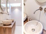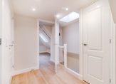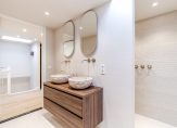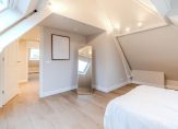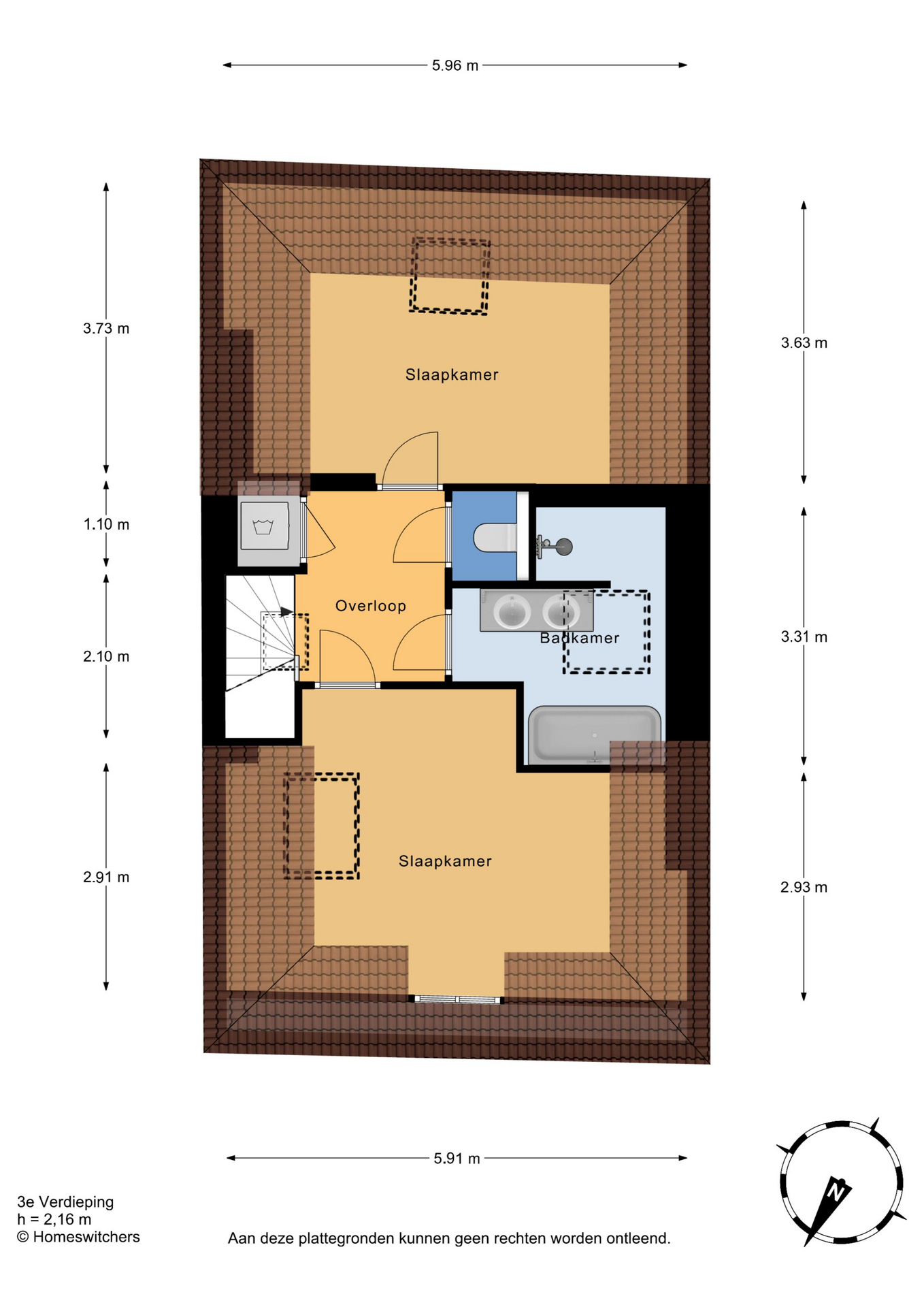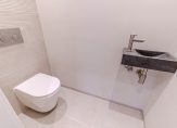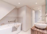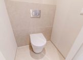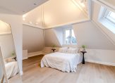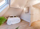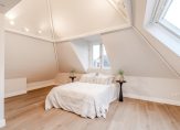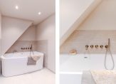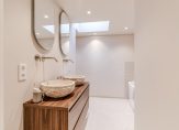 Vanuit de hal de trap naar de derde etage voorzien van overloop met wasruimte en apart toilet, riante slaapkamer met dakkapel aan de voorzijde, tweede goed formaat slaapkamer rustig gelegen aan de achterzijde en tussengelegen badkamer voorzien van hoogwaardig tegelwerk, ligbad, badkamermeubel met waskommen en dubbele kranen, twee spiegels met verlichting, daklicht en inloopdouche met schitterende kranen.