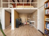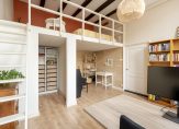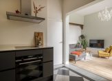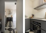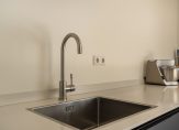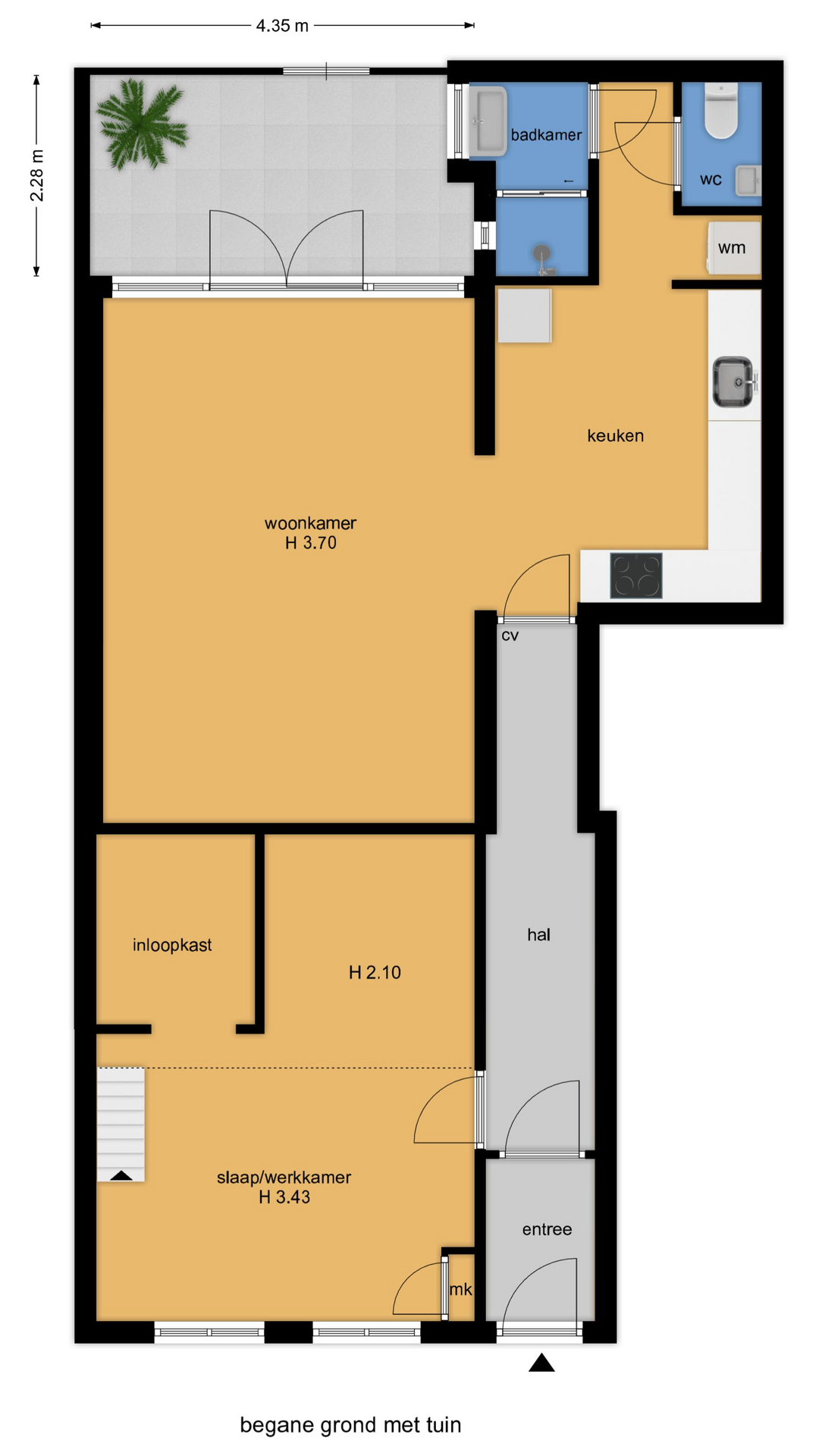 Entree appartement, ruime hal, slaap-/werkkamer aan de voorzijde riant voor formaat en leuk ingericht met entresol, woonkamer gelegen aan de achterzijde met openslaande deuren naar patio op het zuidoosten, luxe open keuken in hoekopstelling voorzien van composiet werkblad, Siemens combioven, rvs afzuigkap, elektrische kookplaat en vaatwasser.