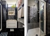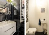 Aan de achterzijde de aansluiting voor de wasmachine en een apart toilet met wandcloset en fonteintje. De badkamer is eveneens aan de achterzijde gelegen en voorzien van tegelwerk, handdoekradiator en douchecabine.