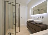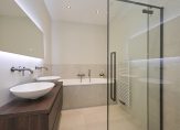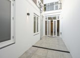Entree van het kleinschalige appartementencomplex, entree van de woning op de begane grond, hal met technische ruimte en toilet voorzien van wandcloset en fonteintje, eerste riante slaapkamer aan de voorzijde met bijna 3 meter hoog plafond. Schitterende badkamer vanuit de hal te bereiken en voorzien van hoogwaardig tegelwerk, inloopdouche met glazen deur, ruim ligbad, badkamermeubel met twee waskommen, ingebouwd leidingwerk en spiegel met verlichting.