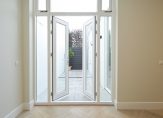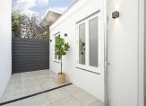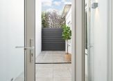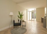 De woonkamer is rustig gelegen aan de achterzijde en beschikt eveneens over een bijna 3 meter hoog plafond, openslaande deuren naar beschutte patio van ca. 14 m² die is voorzien van fraai stukwerk, lichtgrijze tuintegels, zwarte schutting, buitenkraan, verlichting en zinken hemelwaterafvoer.