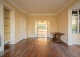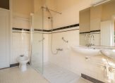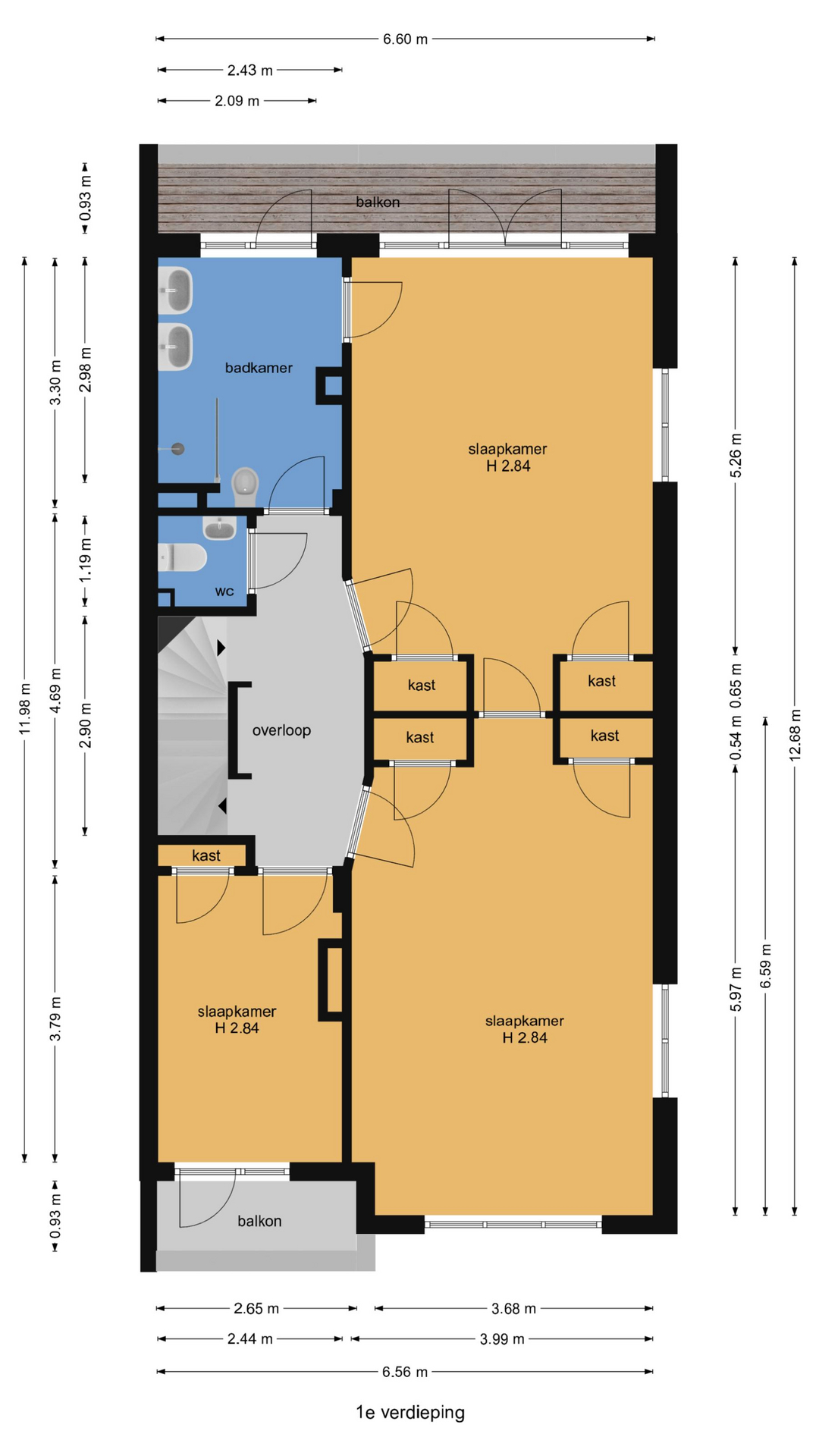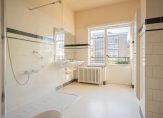 Vanuit de hal de trap naar de eerste etage, brede overloop met apart toilet, wederom riante kamers en suite met aan drie zijden lichtinval, separatie met vaste kasten en charmante schuifdeuren met roedeverdeling, achterbalkon over de volle breedte, zijkamer met voorbalkon en eenvoudige badkamer voorzien van dubbele wastafel, douche en bidet.