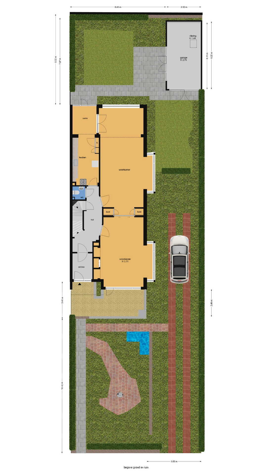 Oprit voor minstens vier auto’s, riante voortuin die na herinrichting voor veel privacy kan zorgen.